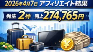 2026年4月7日のアフィリエイト結果を実績公開。発生2件なのに売上274,765円だった印象的な1日です。楽天トラベルと家電が売れた内容を、わかりやすく振り返ります
